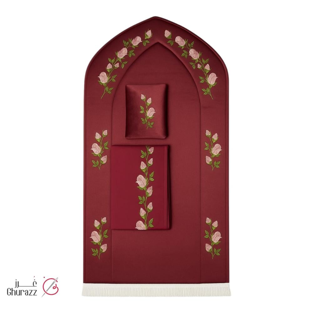 طقم صلاة بلون خمري أنيق وتطريز وردي أنثوي يمنح فخامة كلاسيكية ودفء فريد.
