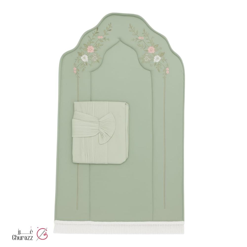 يتكون من سجادة مخملية بلون أخضر نعناعي غني مبطنة بطبقة إسفنجية لتوفير دعم مريح أثناء الصلاة ، مع تصميم مقوس يضفي لمسة روحانية مميزة ، مزينة بتطريز أنيق لزهور ناعمة تضيف لمسة جمالية راقية.